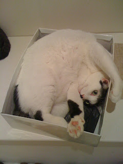 うちの実家には猫が4匹いますが、さすがにこれだけいるとそれぞれに性格の違いが大きくあってなかなか興味深い。白猫のチヨは新しいモノがとにかく好きだから、初めて見たものの上で寝たがる。カバンとか袋があったらとりあえず入りたがる。写真は親父が買ってきた靴の箱に入ってくつろいでるとこ。けっこう窮屈そうだけど。